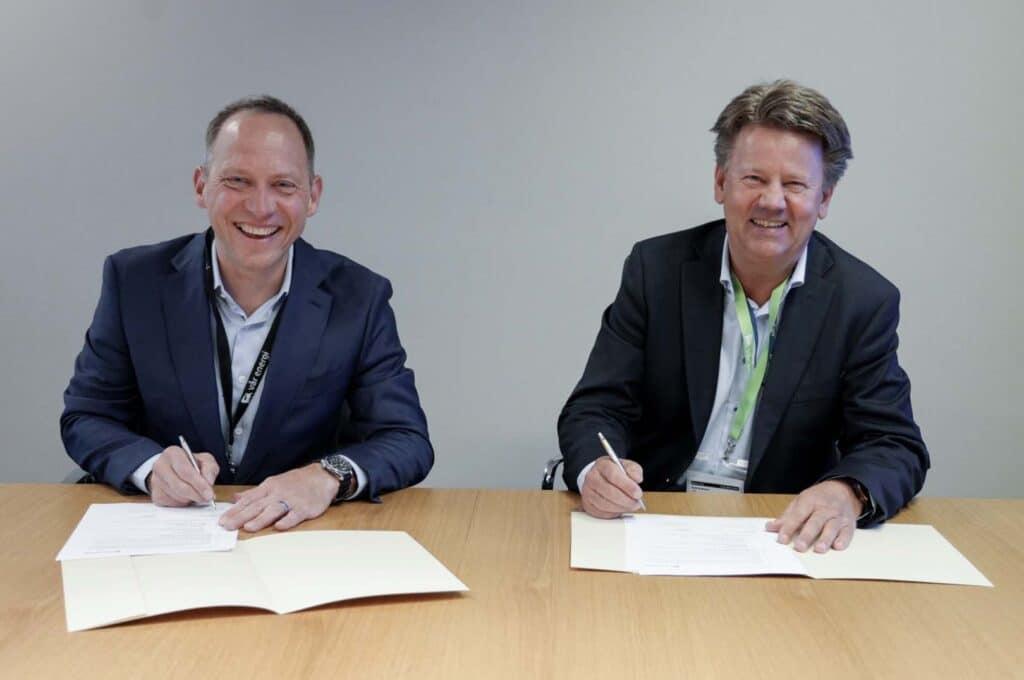 SIGNERING: Torger Rød, COO i Vår Energi (til venstre) og Mads Andersen, CEO for Aibel, undertegnet milliardavtalen hos Vår Energi i Stavanger. Foto: Aibel