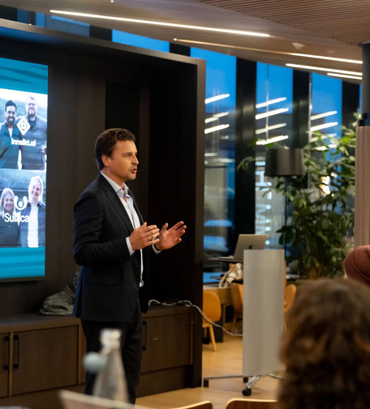 PRESENTASJON: Investorer, stiftelser og kapitalforvaltere var blant deltakerne på Impact StartUps DemoDay i Ferds lokaler i januar. Foto: ImpactStartUp/Andrea Stykket.